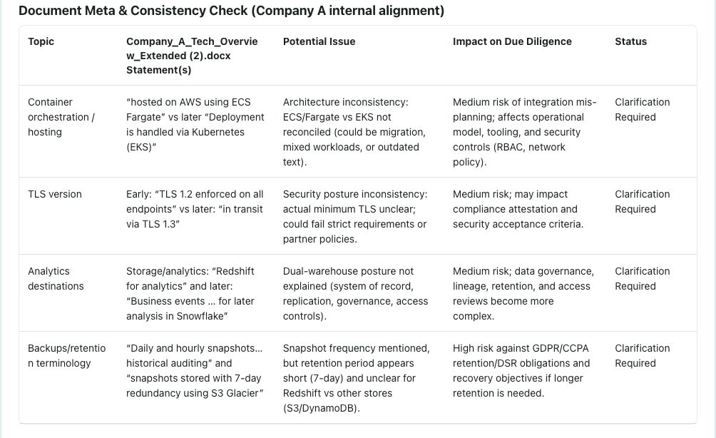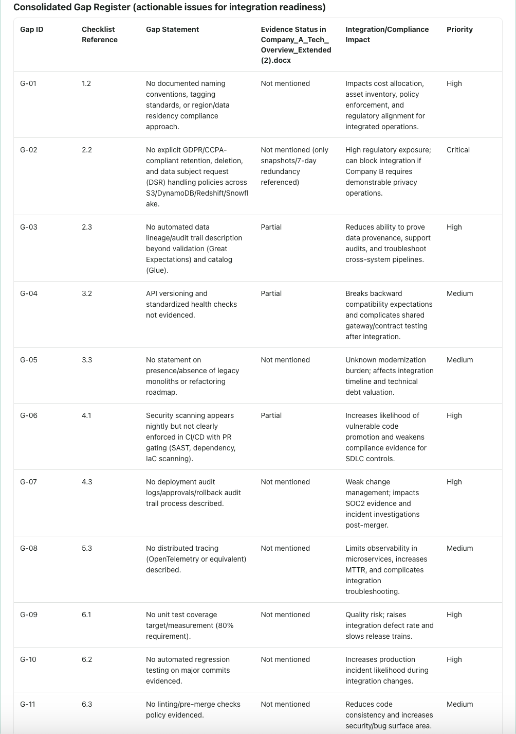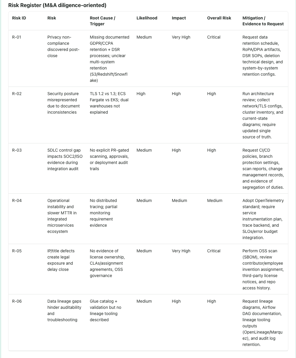 Once gaps were consolidated, they stopped being abstract concerns and became concrete integration risks. Missing retention policies translated directly into regulatory exposure after systems were combined. Unclear TLS standards raised questions about partner compatibility and compliance attestations. Weak CI/CD enforcement created risk during integration-driven code changes. Lack of lineage and observability threatened audit ability and incident response. These risks were not theoretical. Each one mapped back to a specific missing or ambiguous statement in the documentation. That traceability is what makes the output actionable. Instead of saying “security posture unclear,” the analysis could point to exactly what evidence was missing and why it mattered. This shift, from vague concern to explicit risk, is where diligence becomes useful for decision-making.