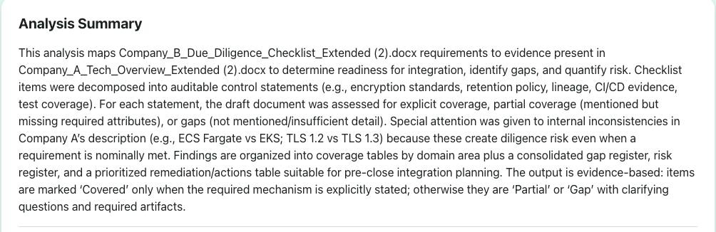 The final outputs of the analysis were designed to support real diligence workflows. Gaps were prioritized based on integration and compliance impact. Risks were framed in terms of likelihood and consequence. Remediation actions were tied to owners, priorities, and acceptance criteria. Equally important, the analysis produced a set of clarifying questions tied directly to checklist requirements. Instead of open-ended follow-ups, the acquiring team could ask precise, defensible questions and request specific evidence. This reduces friction. It shortens diligence cycles. And it helps both sides understand what actually needs to be addressed before close.