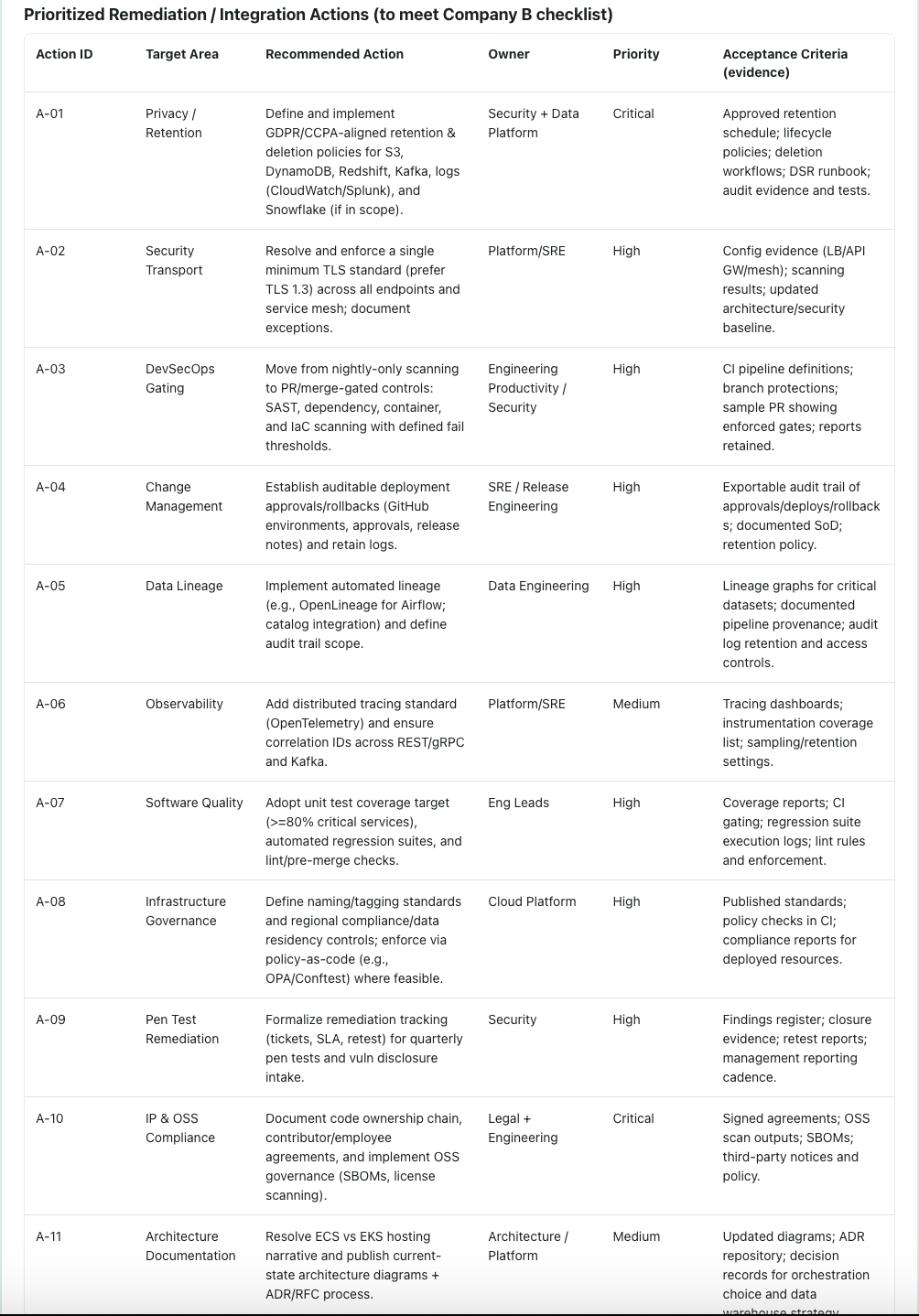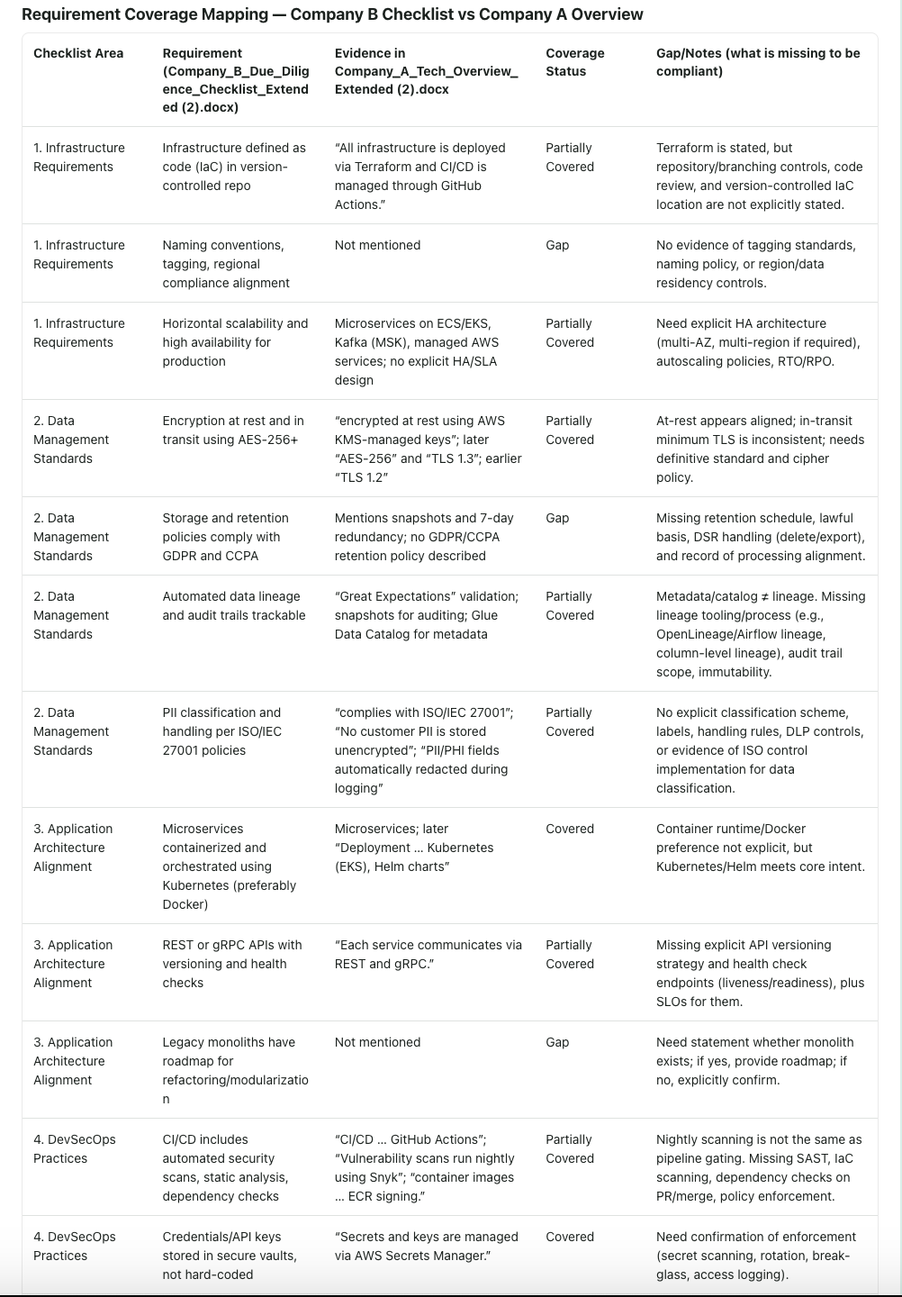 When the acquiring company’s checklist was applied directly to the technical overview, the nature of the gaps became clearer. Many requirements landed in the “partially covered” category. Infrastructure was described as managed through infrastructure-as-code, but details about repository controls, branching strategy, and environment separation were not explicitly stated. Encryption was referenced, but minimum standards and exception handling were unclear. CI/CD pipelines were mentioned, but enforcement points and security gating mechanisms were not described. A smaller but important set of requirements were not addressed at all. Data retention schedules, GDPR/CCPA deletion workflows, lineage tooling, regression testing requirements, and API versioning policies were either missing or too ambiguous to verify. What emerged was not a picture of negligence, but of narrative documentation that was never designed to be evaluated against a formal checklist. That mismatch is common and it’s exactly where diligence risk accumulates.