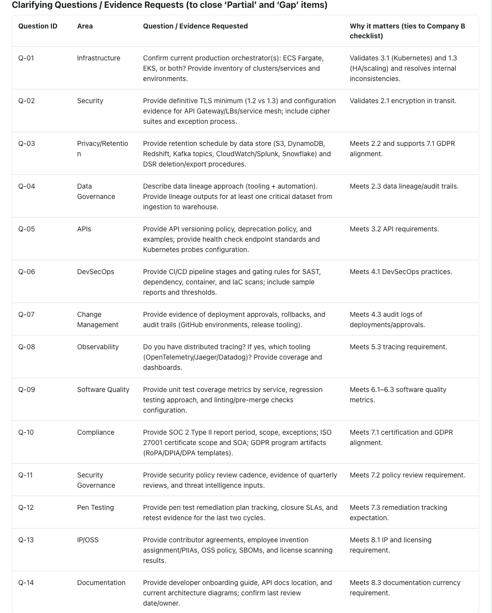 One of the most practical outputs of the analysis wasn’t a score or a summary, but a set of targeted clarifying questions. Each question was tied directly to a specific requirement that was partially covered or ambiguous, making follow-up precise rather than speculative. Instead of broad requests like “provide more detail on security controls,” the questions focused on concrete mechanisms: how encryption standards were enforced, where retention policies were documented, how CI/CD gates were applied, and which systems acted as sources of record. This shifted diligence conversations from defensive explanations to evidence-based clarification. In an M&A context, this matters. Clear questions reduce back-and-forth, shorten diligence cycles, and lower friction between buyer and target. More importantly, they ensure that unresolved gaps are understood intentionally not discovered accidentally after close.